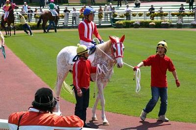 白毛馬「マルマツライブ」デビュー戦は3着 2006.05.25 ホッカイドウ競馬では初となる白毛馬「マルマツライブ号」牝2歳が本日おこなわれた第6競走「フレッシュチャレンジ競走」1000m(9頭)に出走。パドックでは多くのファンの注目を集め単勝4番人気に指示されてむかえたレースではスタートから中段の位置を追走し最後の直線で伸びて3着でゴール。 今後もホッカイドウ競馬での白毛馬初勝利へ向け注目されそうです。 マルマツライブ 牝 2歳 (父ライブリーワン 母トシノフラワー) 馬主 松田 敏雄 管理調教師 楠 克美 生産牧場 村下牧場(浦河町)