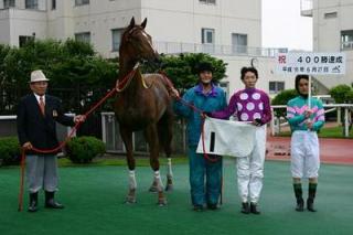 櫻井拓章騎手 400勝達成! 2006.06.27 平成18年6月27日第6レースで、櫻井拓章騎手がワンダーアイアン号に騎乗し400勝を達成しました。 (なお、口取り写真では、川島洋人騎手がプラカード持ちをつとめてくれました。)