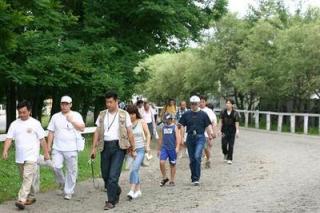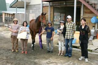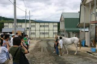 愛馬に逢える! サポートオーナーの集い2006 2006.08.17 8月17日、北海道競馬運営改善対策室主催の「愛馬に逢える! サポートオーナーの集い2006」が開催され、全国から約60名のサポートオーナーが旭川競馬場に駆けつけました。 この企画は、普段立ち入ることの出来ない厩舎地区を見学しながら、自分のサポート馬と対面し、記念写真を撮影することができるという大好評の企画であり、今回で6回目をむかえました。 心配された天候にも恵まれ、ファンは愛馬が登場すると歓声をあげながら写真撮影を行いました。