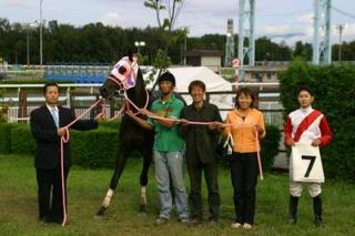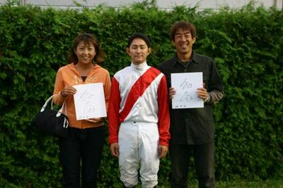 二人はウィナーズサークルで、アケボノユウシャ号と佐々木国明騎手、若松平調教師らと一緒に口取り写真に参加しました。