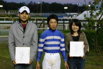 第3回 優勝馬との写真撮影体験 2006.09.14 9月14日、3回目の「優勝馬との写真撮影体験」が旭川競馬場で行われ、抽選で選ばれた一般ファン2名が写真撮影体験を行いました。 写真撮影体験に参加したのは、旭川市内の金子尚広さんと美和さんご夫妻。 二人は、ウィナーズサークルで第7レースの優勝馬ナルニアルーシー号、中村騎手らと一緒に口取り写真撮影に参加しました。 撮影終了後には、中村騎手からサインをもらい喜んでいました。