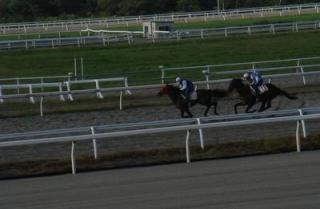 天候:晴れ 馬場:良 7分 一杯 田部調教師(内 テツゴットを1秒先行させ 1馬身遅れ )