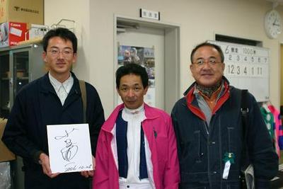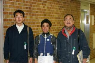 実況放送・検量室見学会! 2006.10.25 10月25日、札幌競馬場で「実況放送・検量室見学会」が行われ、ファン2名が実況放送室などを見学しました。 見学会に参加したのは、札幌市の海老名至さん、海老名健さんの親子。 二人は実況放送室で第6レースのパドック解説とレース実況を観戦し、その後、騎手の様子を検量室で見学しました。 また、父親の至さんは井上俊彦騎手、息子の健さんは山口竜一騎手のファンで、それぞれからサインをもらい記念撮影も行いました。
