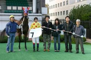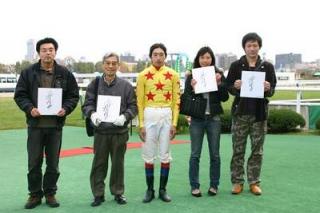 優勝馬との写真撮影体験! 2006.10.26 10月26日、札幌競馬場で、「優勝馬との写真撮影体験」が行われ、一般ファンが第6レース後に写真撮影を体験しました。 写真撮影に参加したのは、札幌市の野呂隆行さん、田中千亜紀さん、笹森将平さん、石井孝雄さんの4名。 4名は第6レースの優勝馬ベルゲンチケット、小林靖幸騎手らと一緒に口取り写真に参加しました。 撮影後には、小林騎手から直接サインをもらい喜んでいました。