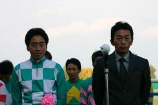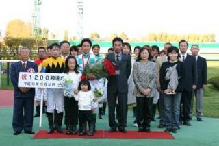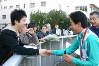 宮崎光行騎手 1,200勝達成表彰式 2006.10.31 10月26日、札幌競馬第2レースで1,200勝を達成した宮崎光行騎手(松本隆宏厩舎)の表彰式が、10月31日、札幌競馬場ウィナーズサークルで行われ、多くのファンや関係者のほか、宮崎騎手の家族からも祝福を受けました。 表彰式終了後には、宮崎騎手から集まったファンに花束やサイン色紙がプレゼントされました。 なお、口取り写真では、沼澤英知騎手がプラカード持ちを務めてくれました。