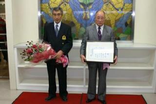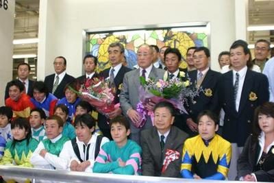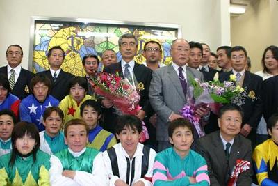 佐藤邦茂調教師・鈴木英二調教師 勇退式 2006.11.09 今年の12月末をもって、ホッカイドウ競馬の調教師を引退する佐藤邦茂調教師と鈴木英二調教師の勇退式が、ホッカイドウ競馬最終日の11月9日に札幌競馬場で行われました。 勇退式では、2人の経歴が紹介された後、主催者や調騎会など関係者から感謝状や記念品、花束などが贈られ2人の労をねぎらいました。