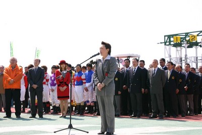 開幕式では、山本副知事、橋本参議院議員、酒井新ひだか町長が挨拶を行った後、今年新しく調教師として開業した岡島調教師と田中調教師に一般ファンから花束が贈られました。