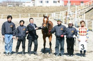 本年度から調教師としてデビューした田中淳司調教師が、4月19日、門別競馬第5レース、全国で最初の新馬戦(2005年度産馬(2歳馬))「JRA認定競走フレッシュチャレンジ競走」に出走したアイファーダイオーで初勝利をあげました。