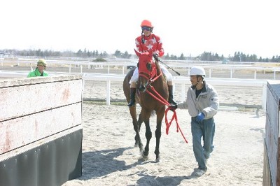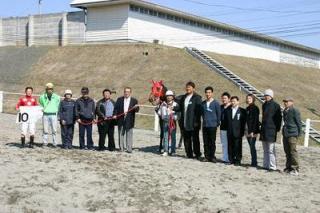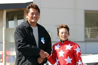 ミスターフォーク 勝利! 2007.04.19 4月19日、元メジャーリーガーの佐々木主浩氏所有のミスターフォーク(牡・3歳)が、門別競馬場第7レースに出走(鞍上・五十嵐冬樹騎手)、4コーナーから最後の直線で2着以下を引き離し1着でゴールを駆け抜けました。 馬主・佐々木主浩氏のコメント 「勝つとやっぱり嬉しかったですね。」 写真 上:勝利直後のミスターフォークと五十嵐騎手 中:馬主・佐々木主浩氏と五十嵐騎手 下:競馬場を訪れた関係者と口取り写真