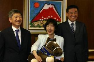 JBC協会会長の吉田勝己氏及び同副会長の吉田照哉氏が来庁し、ホッカイドウ競馬を盛り上げるため、昨年引退したディープインパクト号及びアグネスタキオン号の種付権売却相当額の寄附目録を高橋はるみ知事へ贈呈しました。