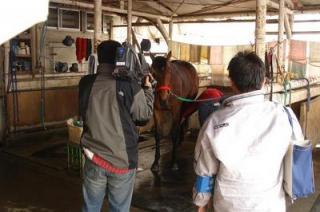 本日(5月1日)、5月3日の8Rフレッシュチャレンジ競走に出走するゼッタイヒルマン(牝 柳澤厩舎所属)の取材(UHB北海道文化放送 Fの炎)が行われました。沖田牧場で生産され、ファイターズ好きのご家族によって日本ハムファイターズのヒルマン監督にあやかり命名された「ゼッタイヒルマン号」。「きかないけど、度胸のよい子。追い切りも優秀でしたし、彼女が勝ってくれてファイターズも勝ってくれたら最高です。」と柳澤調教師。この取材の放映は5月7日の予定。5月3日のゼッタイヒルマン号の走りにご注目ください。