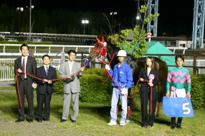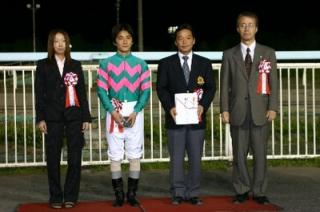 第4回 スタリオン競走表彰プレゼンター 2007.05.30 5月30日、旭川競馬場で「第4回 スタリオン競走表彰プレゼンター」が行われました。 第4回目は「スターリングローズ賞」で、旭川市の国部りえさんがプレゼンターを務め、優勝馬マチカネアオイの廣森調教師(馬主代理)、川島洋人騎手に記念品を贈呈しました。 なお、プレゼンターには、㈱優駿から提供された、種牡馬パンフレットが贈られました。 写真 上:プレゼンターの同僚も一緒に口取り写真 中:優勝した川島洋人騎手へトロフィーを贈呈 下:関係者と一緒に記念撮影