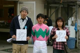 2名は実況放送室で古川アナウンサーとホースニュース馬の小倉記者が担当したパドック解説とレース実況を観戦し、また、検量室では小野望騎手・三井健一騎手と記念撮影をしました。