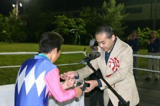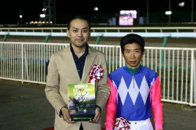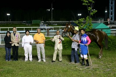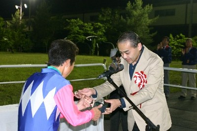 第8回目は「アグネスフライト賞」で、旭川市の金子尚広さんがプレゼンターを務め、優勝馬インカローズの國信調教師(馬主代理)、小国博行騎手に記念品を贈呈しました。
