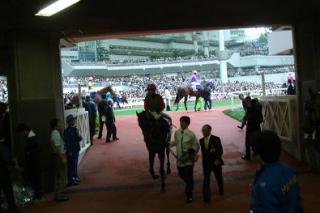 地下馬道へ向かう五十嵐騎手、田部調教師、榎並厩務員