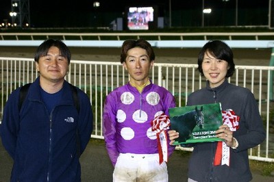 第11回目は「エアエミネム賞」で、兵庫県のファンがプレゼンターを務め、優勝馬シェレルダンサーの林正夫調教師(馬主代理)、櫻井拓章騎手に記念品を贈呈しました。
