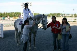 参加者は実況放送室で古川アナウンサーと競馬ブックの高倉記者が担当したパドック解説と太田アナウンサーの実況放送を見学し、その後、検量室では齊藤正弘騎手、櫻井拓章騎手からサインをもらい、また、誘導馬と記念撮影をしました。