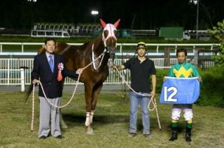上:優勝のコウエイベストと桧森調教師・山口騎手