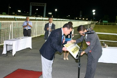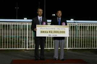 今回行われた第1回目は、『ディープインパクト・プレミアムⅠ』で、山口竜一騎手騎乗のコウエイベストが勝利し、表彰式では、桧森調教師(馬主代理)が1着賞金250万円のパネルを受け取りました。