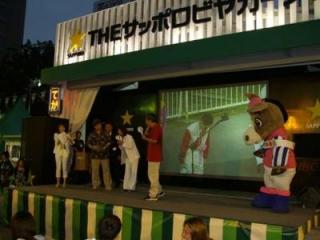 大通りビアガーデンサッポロビール会場でPRイベントを実施 2007.07.27 7月26日(木)大通ビアガーデン「サッポロビールイベント会場」にてホッカイドウ競馬PRイベントが実施されました。 会場にはホクトくんも登場しホッカイドウ競馬のPRやクイズ大会でが行われ、また会場の大型スクリーンにはホッカイドウ競馬では初の取り組みとなる旭川ナイトレースのライブ映像が放映され、会場の中には事前に馬券を購入してきた方やスポーツ新聞片手に携帯で購入する姿もあり盛り上がりました。