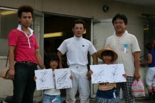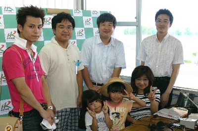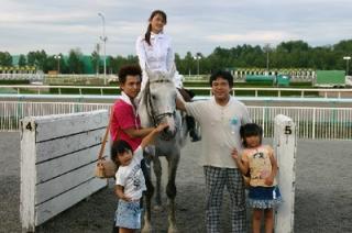 第3回 親子見学会 2007.08.14 8月14日、旭川競馬場において『第3回 親子見学会』が行われ、新十津川町の親子2名と小樽市の親子2名が参加しました。 参加者は、普段立ち入ることの出来ない装鞍所で職員の説明を聞き、その後、決勝審判室などを見学し、検量室では、川島(雅)騎手、五十嵐騎手からサインをもらい、記念撮影をしました。 また、検量室前で誘導馬のヨシカツヒーローに実際に触れ記念撮影をし、大喜びでした! 写真 上:検量室前で五十嵐騎手と記念撮影 中:誘導馬に触れ、感動!(ちょっと怖い?) 下:実況室で記念撮影