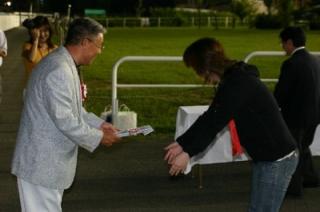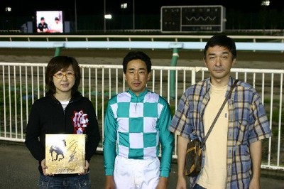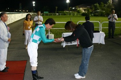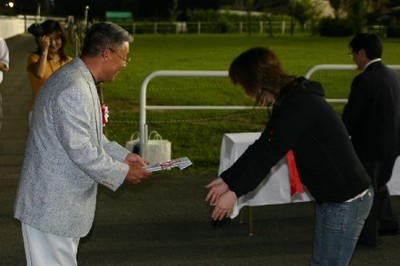 第29回 スタリオン競走表彰プレゼンター 2007.08.29 8月29日、旭川競馬場で「第29回 スタリオン競走表彰プレゼンター」が行われました。 第29回目は「クロフネ賞」で、恵庭市のファンがプレゼンターを務め、優勝馬モエレフェミニンの堂山調教師(馬主代理)と宮崎騎手にそれぞれ記念品を贈呈しました。 また、プレゼンターには、社台スタリオンステーションから提供された「種牡馬パンフレット」が贈られました。 写真 上:堂山調教師(馬主代理)へ目録贈呈 中:宮崎騎手へトロフィーの贈呈 下:「種牡馬パンフレット」を手に記念撮影