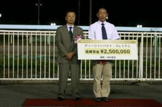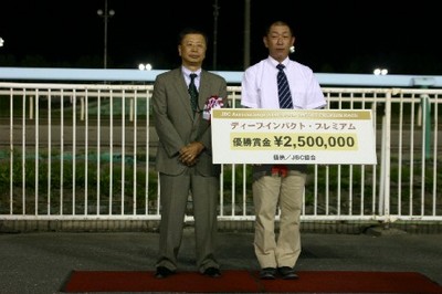 このレースでは、川島洋人騎手騎乗のサクラハーンが勝利し、表彰式では、林和弘調教師(馬主代理)が1着賞金250万円のパネルを受け取りました。