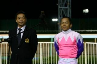 中:旭川競馬場ファンへの挨拶(左…廣森調教師、右…川本騎手)