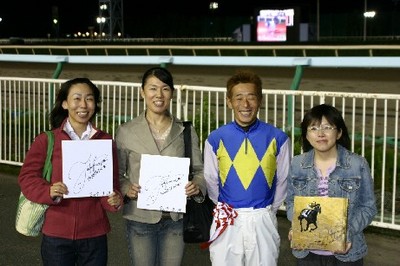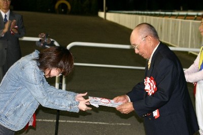 第35回 スタリオン競走表彰プレゼンター 2007.09.19 9月19日、旭川競馬場で「第35回 スタリオン競走表彰プレゼンター」が行われました。 第35回目は「スウェプトオーヴァーボード賞」で、深川市のファンがプレゼンターを務め、優勝馬マイレディーキセキの林正夫調教師(馬主代理)と服部騎手にそれぞれ記念品を贈呈しました。 また、プレゼンターには、社台スタリオンステーションから提供された「種牡馬パンフレット」が贈られました。 写真 上:優勝馬マイレディーキセキと口取り写真 中:林正夫調教師へ目録贈呈 下:「種牡馬パンフレット」と「サイン」をもらい記念撮影