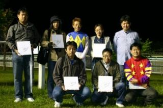 第17回 優勝馬との写真撮影体験! 2007.09.27 9月27日、旭川競馬場で、第17回「優勝馬との写真撮影体験」が行われ、ファン7名が写真撮影を行いました。 参加者は、第8レースの優勝馬クラマキシム、服部騎手らと口取り写真に参加しました。 撮影後には、服部騎手からサインをもらい記念撮影をしました。 写真 上:優勝馬クラマキシムとの口取り写真 下:服部騎手からサインをもらい記念撮影