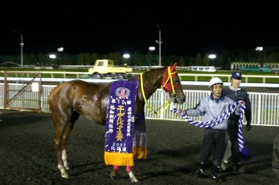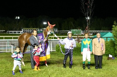 第10回 エーデルワイス賞〔JpnⅢ〕マサノミネルバ(山口騎手)が優勝!! 2007.10.11 10月11日、旭川競馬場で『第10回 エーデルワイス賞』(サラ 2歳牝馬オープン 1,600m)が行われ、山口騎手騎乗の5番人気マサノミネルバ(堂山厩舎)が1分43秒3で勝利! 山口騎手は、北斗盃に続き今季重賞2勝目! マサノミネルバは、中団の位置から競馬を進め、4コーナーから直線にかけて先頭に立ち、最後は2着に5馬身差をつけゴール! 優勝の山口騎手コメント 「今日は馬を信じて乗りました。馬に感謝しています。」 写真 上:レース直後のマサノミネルバ 中:優勝馬との口取り写真 下:勝利の山口騎手
