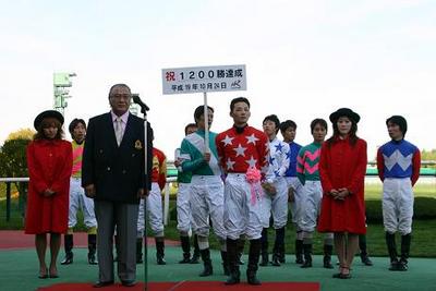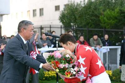 五十嵐冬樹騎手 1,200勝達成表彰式! 2007.10.25 10月25日、札幌競馬場で前日(10月24日)に1,200勝を達成した五十嵐騎手(桑原厩舎)の表彰式が同競馬場ウィナーズサークルで行われ、かけつけた多くのファンや関係者の祝福を受けました。 また、表彰式終了後には、五十嵐騎手から集まったファンに花束やサイン色紙がプレゼントされました。 写真 上:(左)桑原調教師、(右)五十嵐騎手 中:表彰式には騎手仲間も後ろに整列 下:堂山調騎会長から花束贈呈