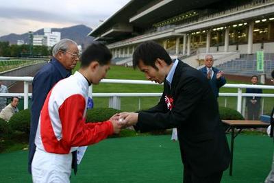 第45回 スタリオン競走表彰プレゼンター 2007.10.30 10月30日、札幌競馬場で「第45回 スタリオン競走表彰プレゼンター」が行われました。 第45回目は「リンカーン賞」で、札幌市のファンがプレゼンターを務め、優勝馬ブライズメイトの馬主様と佐々木騎手にそれぞれ記念品を贈呈しました。 また、プレゼンターには、 社台スタリオンステーションから提供された『種牡馬パンフレット』が贈られました。 写真 上:優勝馬ブライズメイトとの口取り写真 中:佐々木騎手へトロフィー贈呈 下:佐々木騎手と記念撮影