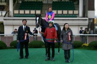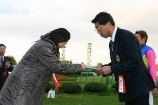 第47回 スタリオン競走表彰プレゼンター 2007.11.07 11月7日、札幌競馬場で「第47回 スタリオン競走表彰プレゼンター」が行われました。 第47回目は「アドマイヤジャパン賞」で、新ひだか町のファンがプレゼンターを務め、優勝馬ディアダンサーの谷口調教師(馬主代理)と服部騎手にそれぞれ記念品を贈呈しました。 また、プレゼンターには、(株)サラブレッド・ブリーダーズ・クラブから提供された『種牡馬パンフレット』が贈られました。 写真 上:優勝馬ディアダンサーとの口取り写真 中:谷口調教師へ目録贈呈 下:服部騎手と記念撮影