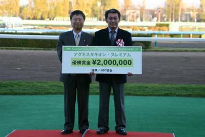 『アグネスタキオン・プレミアムⅢ』実施! 2007.11.13 11月13日、札幌競馬第9競走で、スタリオン・プレミアムシリーズ『アグネスタキオン・プレミアムⅢ』が実施されました。 このレースでは、宮崎騎手騎乗のエムオーステージが勝利し、表彰式では、村上調教師(馬主代理)が1着賞金200万円のパネルを受け取りました。 このレースは、JBC協会から、JRAで活躍し引退したディープインパクトとアグネスタキオンの種付権相当額をご寄附いただいたことから、レースの賞金として活用し、「スタリオン・プレミアムシリーズ」として創設しました。 写真:賞金パネルを持ち記念撮影