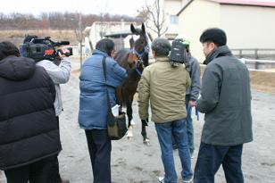 馴致の状況は順調で、性格は穏やか、頭も良く、心肺能力も優秀と関係者に評価されています。沢山の報道陣にかこまれ、額の流星に向かってシャッターが切られている中、少しも動じることのないその姿は「大物」そのもの。