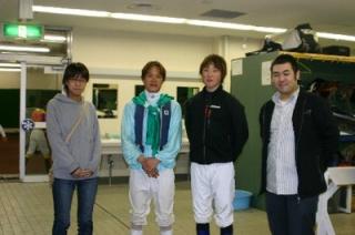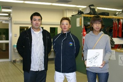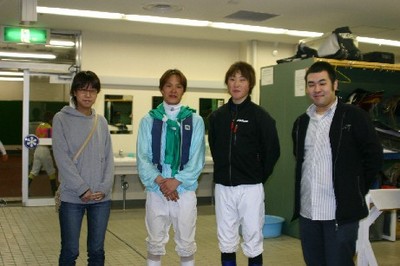 第3回 実況放送室・検量室観戦ツアー 2008.05.14 5月14日、札幌競馬場において、「第3回 実況放送室・検量室観戦ツアー」が行われ、ファン2名が見学しました。 今回参加したのは、札幌市から2名。 2名は実況放送室で古川アナウンサーと競馬ブックの高倉記者が担当した第6レースのパドック解説と古川アナウンサーが担当したレース実況を観戦、その後、検量室では桑村真明騎手や川島雅人騎手、五十嵐冬樹騎手と記念撮影し、サインをもらいました。 写真 上:実況放送室で記念撮影 中:桑村騎手、川島騎手と記念撮影 下:五十嵐騎手と記念撮影