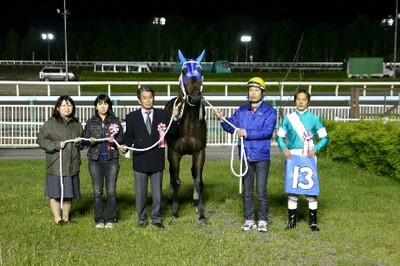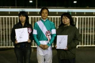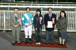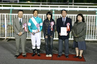 第3回 スタリオン競走表彰プレゼンター 2008.05.28 5月28日、旭川競馬場で「スタリオン競走表彰プレゼンター」が行われました。 第3回目は「ローエングリン賞」で、旭川市のファンがプレゼンターを務め、優勝馬ミラクルカフェの村上正和調教師(馬主代理)と川島雅人騎手にそれぞれ記念品を贈呈しました。 また、プレゼンターには、社台スタリオンステーションから提供された『スタリオンブック』等が贈られました。 写真 上:優勝馬ミラクルカフェと口取り写真 中:関係者と記念撮影 下:川島雅人騎手からサインをもらい記念撮影