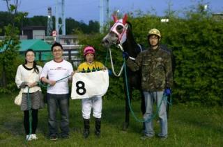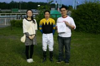 第3回 優勝馬との写真撮影体験! 2008.05.29 5月29日、旭川競馬場で「第3回 優勝馬との写真撮影体験」が行われ、旭川市のファン2名が写真撮影を行いました。 参加者は、第7レースの優勝馬ゴッドビラブドミー、沼澤英知騎手らと口取り写真に参加しました。 写真 上:優勝馬と口取り写真 下:沼澤騎手からサインをもらい記念写真
