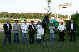 第6回 優勝馬との写真撮影体験! 2008.06.26 6月26日、旭川競馬場で「第6回 優勝馬との写真撮影体験」が行われ、 大阪府のファン2名が写真撮影を行いました。 参加者は、第8レースの優勝馬ラブラブガッキー号、優勝馬関係者と口取 り写真に参加しました。 写真 上:優勝馬ラブラブガッキー号と口取り写真 下:優勝馬関係者と記念写真
