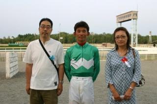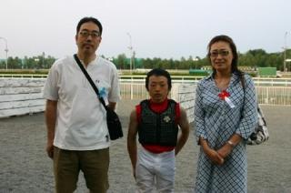 第9回 実況放送室・検量室観戦ツアー 2008.07.02 7月2日、旭川競馬場において、「第9回 実況放送室・検量室観戦ツアー」 が行われ、旭川市のファン2名が見学しました。 2名は実況放送室で古川アナウンサーと内外タイムス社古谷記者が担当した第7 レースのパドック解説と古川アナウンサーが担当したレース実況を観戦、その後、 検量室では齊藤正弘騎手、黒澤愛斗騎手、櫻井拓章騎手と記念撮影し、サインをも らいました。 写真 上:実況放送室で記念撮影 中:齊藤正弘騎手と記念撮影 下:黒澤愛斗騎手と記念撮影
