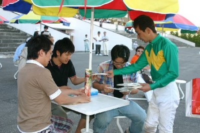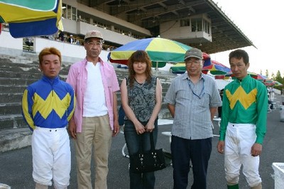 第3回ジョッキーシート プレゼンターは秋田大助騎手と山口竜一騎手! 2008.07.15 7月15日、3回目の「旭川競馬場ジョッキーシート」が行われ、ラッキーシートのプレゼンターは秋田大助騎手と山口竜一騎手が務めました。 第5レース終了時に当選シートが発表され、シート使用者にホッカイドウ競馬騎手部会よりお食事券がプレゼントされ、サインや握手にも応えファンの皆様も大喜びでした。