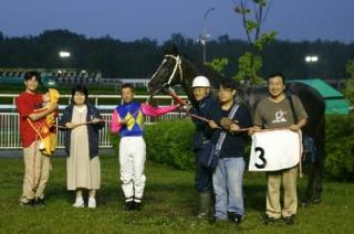 第9回 優勝馬との写真撮影体験! 2008.07.17 7月17日、旭川競馬場で「第9回 優勝馬との写真撮影体験」が行われ、滝川市と兵庫県、神奈川県から計5名のファンが写真撮影を行いました。 参加者は、第7レースの優勝馬ヤマノベガ号、服部茂史騎手らと口取り写真に参加しました。 写真 優勝馬ヤマノベガ号と口取り写真