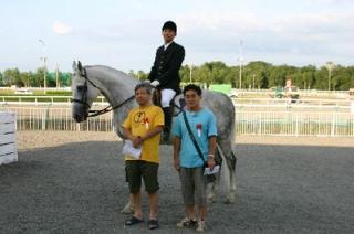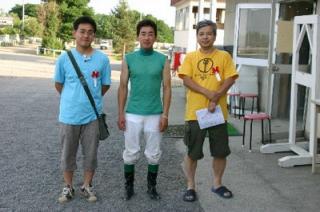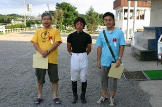 第11回 実況放送室・検量室観戦ツアー 2008.07.30 7月30日、旭川競馬場において、「第11回 実況放送室・検量室観戦ツアー」が行われ、旭川市と名寄市のファンが見学しました。 2名は実況放送室で古川アナウンサーと競馬ブックの高倉記者が担当した第7レースのパドック解説を観戦、その後、検量室では宮崎光行騎手と三井健一騎手と記念撮影し、サインをもらいました。 写真 上:宮崎光行騎手と記念撮影 中:三井健一騎手と記念撮影 下:誘導馬と記念撮影