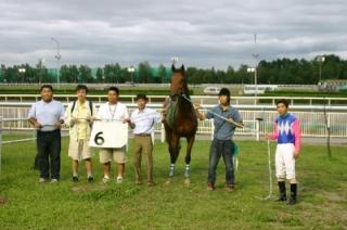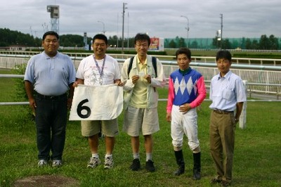 第10回 優勝馬との写真撮影体験! 2008.07.31 7月31日、旭川競馬場で「第10回 優勝馬との写真撮影体験」が行われ、東京都と長崎県から計3名のファンが写真撮影を行いました。 参加者は、第8レースの優勝馬マダムビジュー号、山田和久調教師、小国博行騎手らと口取り写真に参加しました。 【写真】 優勝馬マダムビジュー号と口取り写真 山田和久調教師、小国博行騎手と記念写真