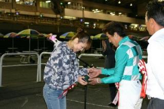 第26回 スタリオン競走表彰プレゼンター 2008.08.19 8月19日、旭川競馬場で第26回「スタリオン競走表彰プレゼンター」が行われました。 第25回目は「ボーンキング賞」で、旭川市のファンがプレゼンターを務め、優勝馬ディーズエトワール号の松本隆宏調教師(馬主代理)と宮崎光行騎手にそれぞれ記念品を贈呈しました。 また、プレゼンターには、(株)サラブレッド・ブリーダーズ・クラブから提供された『スタリオンブック』等が贈られました。 写真 上:優勝馬ディーズエトワール号と口取り写真 中:宮崎光行騎手記念品贈呈 下:宮崎光行騎手と記念写真