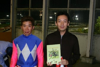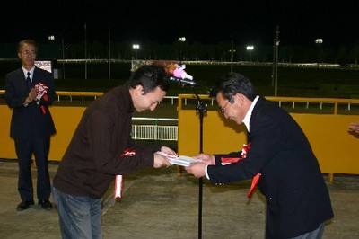 第29回 スタリオン競走表彰プレゼンター 2008.08.27 8月27日、旭川競馬場で第29回「スタリオン競走表彰プレゼンター」が行われました。 第29回目は「マイネルセレクト賞」で愛知県のファンがプレゼンターを務め、優勝馬モエレエトワール号の村上調教師(馬主代理)と小国博行騎手にそれぞれ記念品を贈呈しました。 また、プレゼンターには、(有)ビッグレッドファームから提供された『スタリオンブック』等が贈られました。 写真 上:村上調教師(馬主代理)へ目録贈呈 下:関係者と記念写真