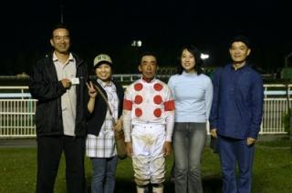 第12回 優勝馬との写真撮影体験! 2008.08.28 8月28日、旭川競馬場で「第12回 優勝馬との写真撮影体験」が行われ、 兵庫県から2名、神奈川県と東京都から4名のファンが写真撮影を行いました。 参加者は、第7レースの優勝馬フレキシブル号、優勝馬関係者と口取 り写真に参加しました。 写真 上:優勝馬フレキシブル号と口取り写真 下:坂下秀樹騎手と記念写真