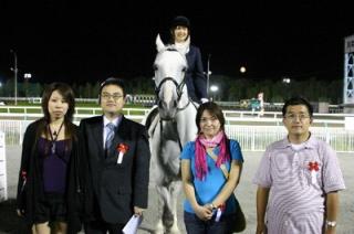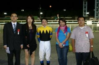 第18回 実況放送室・検量室観戦ツアー 2008.09.17 9月17日、旭川競馬場において、「第18回 実況放送室・検量室観戦ツアー」が行われ、神奈川県と札幌市から4名のファンが見学しました。 4名は実況放送室で古川アナウンサーと競馬ブックの高倉記者が担当した第7レースのパドック解説を観戦、その後、検量室では誘導馬や沼澤英知騎手と記念撮影をしました。 写真 上:沼澤英知騎手と記念撮影 下:誘導馬と記念撮影