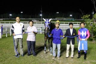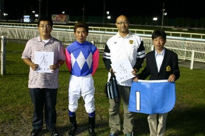 第13回 優勝馬との写真撮影体験! 2008.09.18 9月18日、旭川競馬場で「第13回 優勝馬との写真撮影体験」が行われ、 神奈川県と兵庫県から2名のファンが写真撮影を行いました。 参加者は、第7レースの優勝馬 ゴールドコイン号、優勝馬関係者と口取 り写真に参加しました。 写真 上:優勝馬 ゴールドコイン号と口取り写真 下:小国博行騎手と記念写真